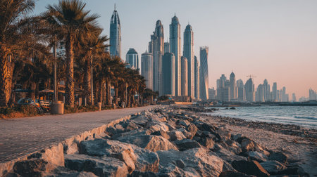 A scenic coastal vista showcases a modern city skyline. Palm trees line a walkway, while the beach meets the sea. The image features a warm color palette with natural lighting. This shot is suitable for various commercial uses, including travel, urban development, and architectural themes.