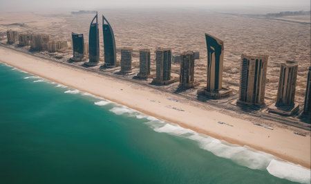 An aerial view of a beach lined with skyscrapers in Dubai