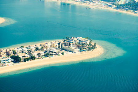 Close up view of luxury homes and villas on palm jumeirah islands , vacation destination homes real estate in Dubai