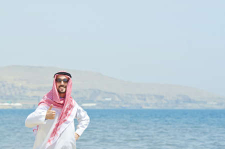 Middle eastern man with traditional dress and kandora on the beach