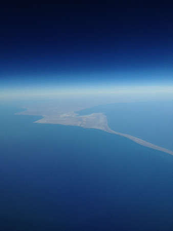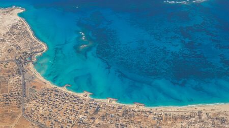 Earth's line. A perspective of the ground's colors and shapes. Aerial view of the Egyptian coast overlooking the Mediterranean sea. View from the airplane window. Sea with fantastic turquoise colors