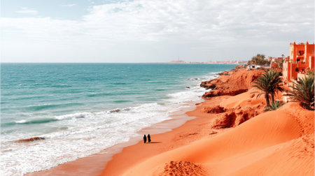Two people strolling along a rugged sandy coastline with ocean waves