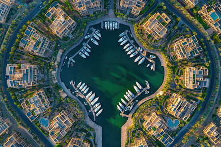 This vibrant marina is filled with various yachts docked in clear waters, surrounded by modern buildings. Lush greenery complements the urban design and creates a picturesque atmosphere.