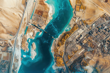 Aerial perspective captures the striking contrast between the blue river and arid desert terrain, showing water flow.