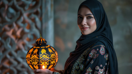 Beautiful muslim woman holding lantern. Ramadan Kareem concept.