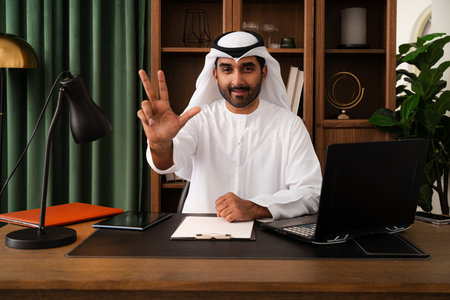 Middle-eastern businessman wearing emirati kandura working in the office - emirati businessman in traditional kandura sitting at a desk, gesturing three during a meeting or presentation