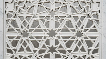 Islamic geometry pattern made from metals and ground fiber reinforcement concrete used as building facade as wall decoration.