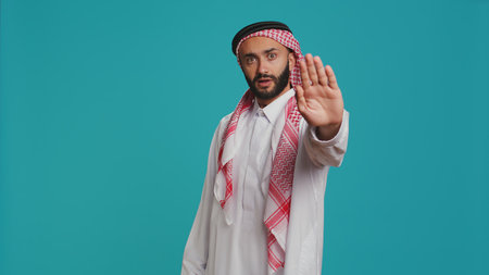 Middle eastern person does stop sign with palm up, expressing refusal and denial on studio camera. Young man presenting rejection symbol, being displeased and disappointed.