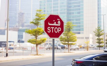 Arabic Stop Sign, United Arab Emirates, against cityscape