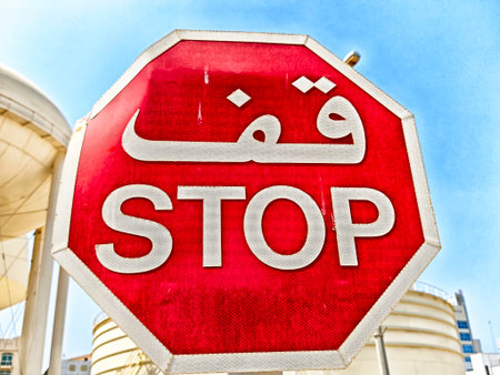 A vibrant stop sign features both Arabic and English text, set against a bright blue sky and industrial background in a city location.