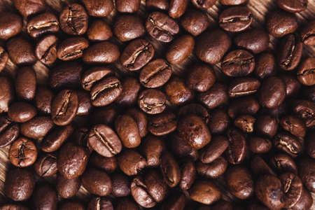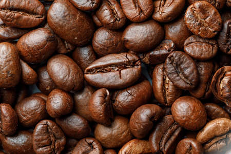 Background of roasted coffee beans, top view, close up