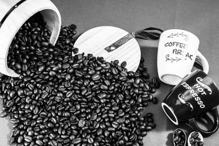 coffee beans on wood table for hot drink or coffee concept.