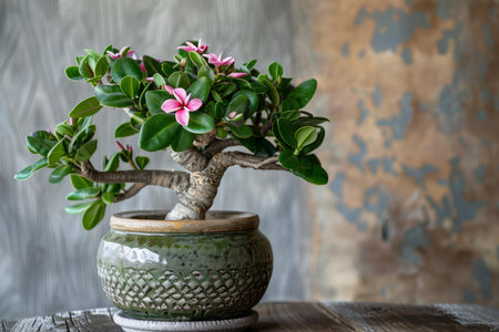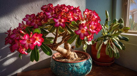 A stunning adenium bonsai displays vibrant pink flowers against a serene backdrop, showcasing its beauty in natural light, perfect for home decor.