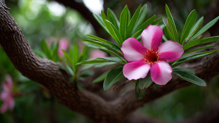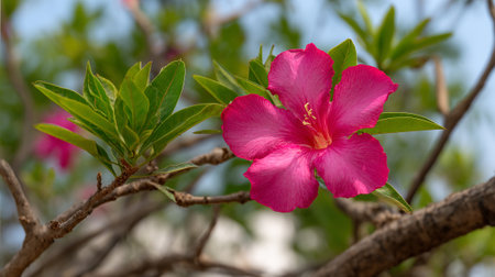 Vibrant Desert Rose Blossom on Tree Branch in Natural Light