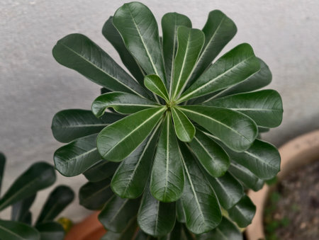 Adenium obesum (Desert Rose) in pot with symmetrical glossy leaves and central growth point.