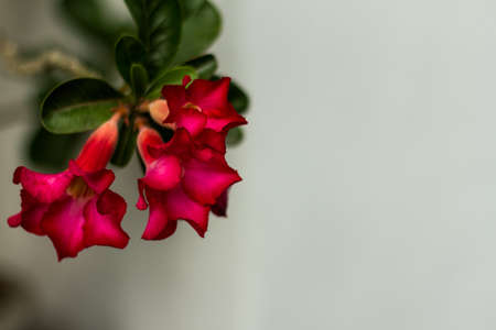 Branches of red petals Adenium flower plant or desert rose blossom on blurry green leaf background