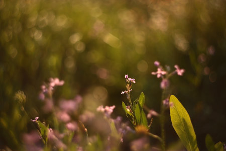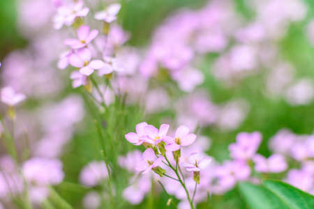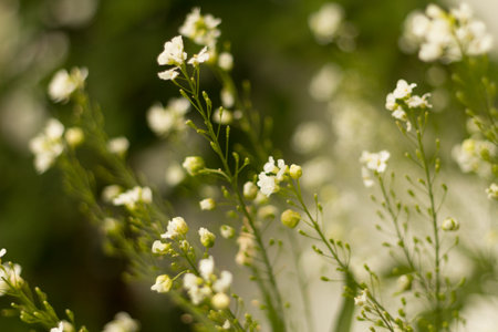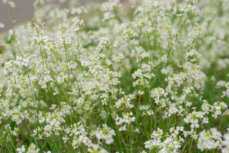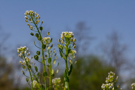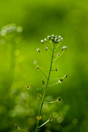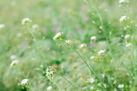 Close up of Capsella bursa-pastoris blooming in spring field. Summer Spring nature background.