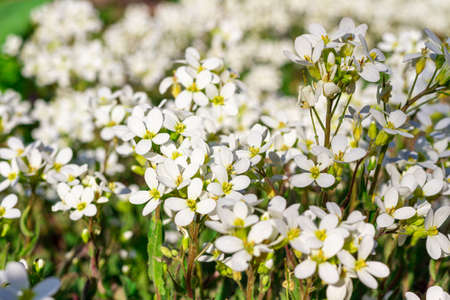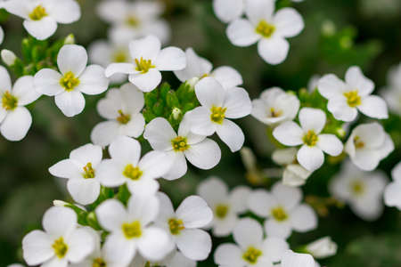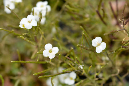 Mountain rock cress flowers and seed pods - Latin name - Arabis caucasica