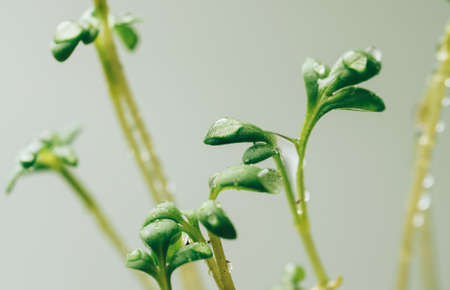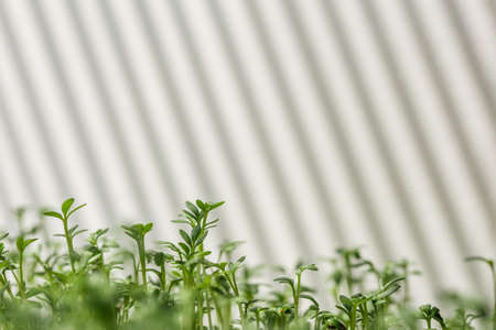 Sprouted seeds in a plastic container. Micro greens grown in a greenhouse