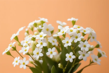 Beautiful white flowers on peach color background wallpaper. AI generated