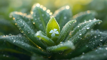 A captivating close-up of vibrant green flora adorned with glistening water droplets, showcasing the delicate beauty of nature in a tranquil environment.