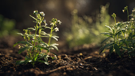 Nemesia with small fresh leaves, growing upright in fertile soil, sunlight filtering gently, realistic textures, vibrant green tones, natural photography style, wide balanced composition for timelapse video.