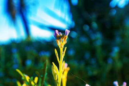 close up of beautiful artistic wild flower or weed against a blue green background wide image for banner ,backdrop or wall paper.