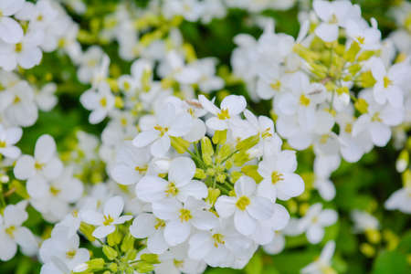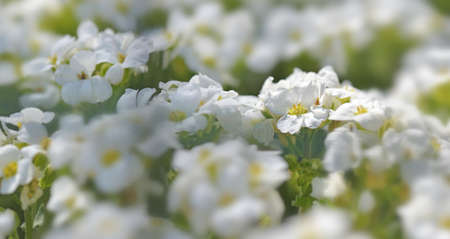 Natural evergreen candytuft flowers or blooming Iberis sempervirens close up with selective focus and bokeh