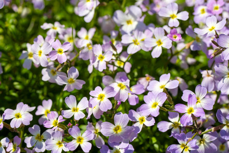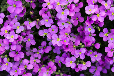 Pink purple spring AUBRIETA garden flowers. Close up of a carpet with beautiful flowers. Aubrieta Groundcover.