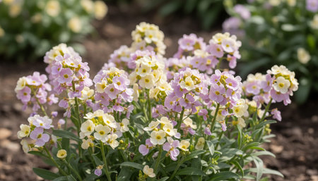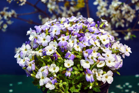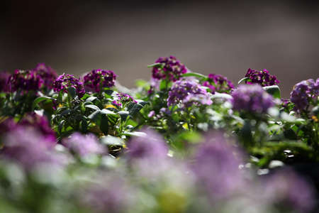 Lobularia blossom with purple white small flowers, many inflorescences on a thin stem, close-up. Garden ornamental flowering plant.