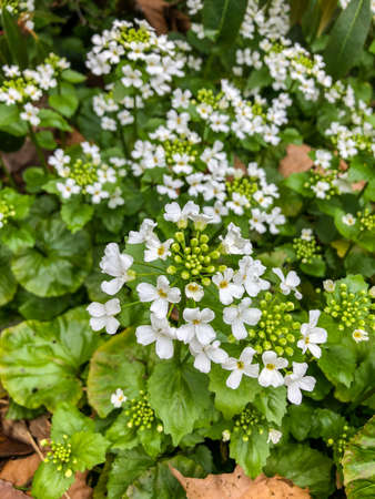 Fresh white Arabis caucasica blossoming flowers on green leaves background in the garden in spring season close up.