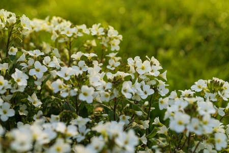 Close up of garden arabis mountain rock cress white flowers. Arabis in soft warm morning sunbeams