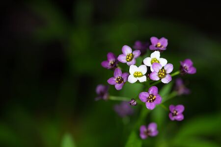 Petite snow white mauve flowers of Lobularia maritima Alyssum maritimum, sweet alyssum or sweet alison, alyssum genus Alyssum is a species of low-growing flowering plant in family Brassicaceae.