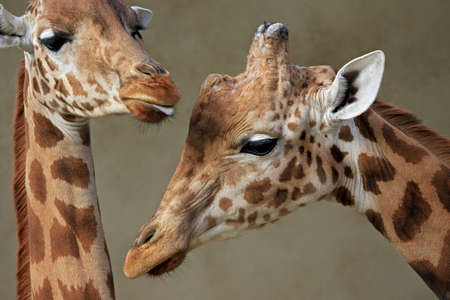 Two adult giraffe looking in different directions close-up in the cold season in cloudy weather.