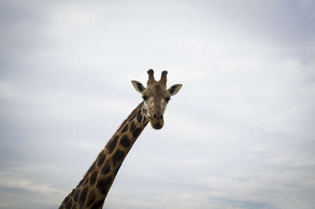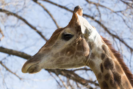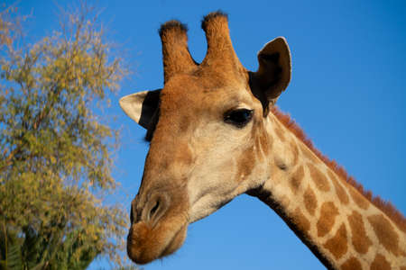 Wild african animal. Close up of large common Namibian giraffe on the summer blue sky.
