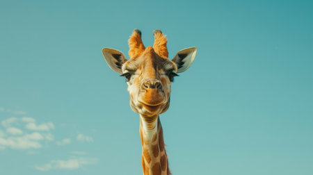 A portrait of a giraffe set against a bright blue sky.