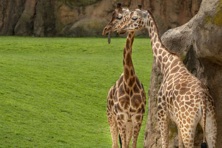Giraffes on animal enclosure in zoo with green grass pasture
