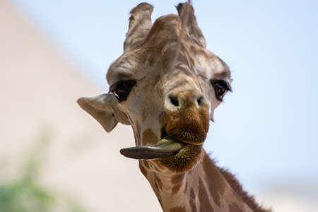 A close up of a giraffe (giraffa) head with tongue out in Africa.