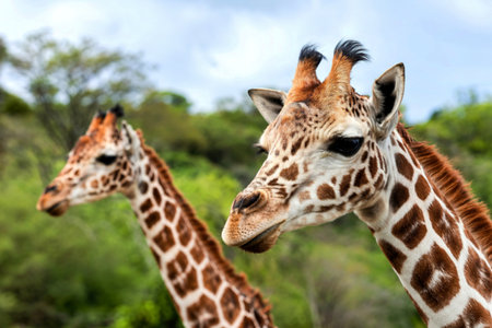 Photo of a beautiful South African giraffe on safari in the African savannah, it is a herbivorous animal that lives in its group in harmony.