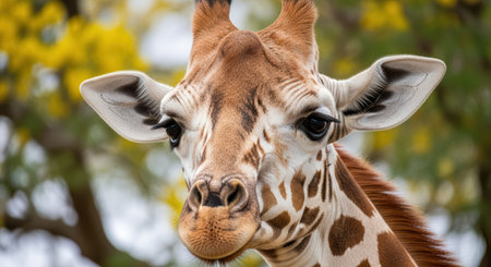 Majestic giraffe portrait with yellow blossoms in natural habitat