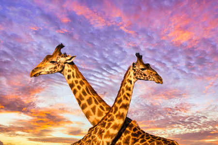 Giraffes and sunset in Tsavo East and Tsavo West National Park in Kenya