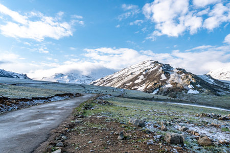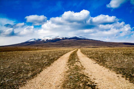 A dirt road leads up the mountain. White clouds over the mountain. The top of the mountain is covered with snow