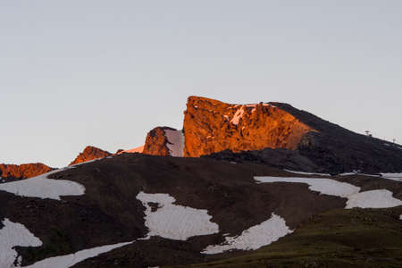 Sunny mountain desert relief with glacier in sunlight under low cloudy sky. Scenic highlands landscape with small glacier high in mountains on hills. Minimalist mountain scenery of highland desert.
