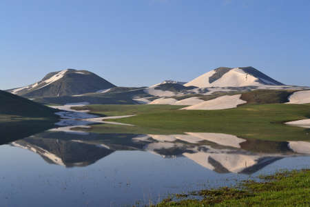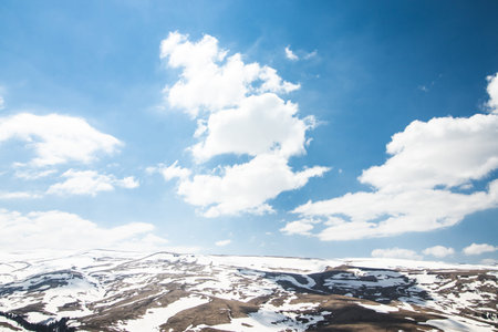 Lago Naki spring plateau with snowy hills, blue sky and clouds.