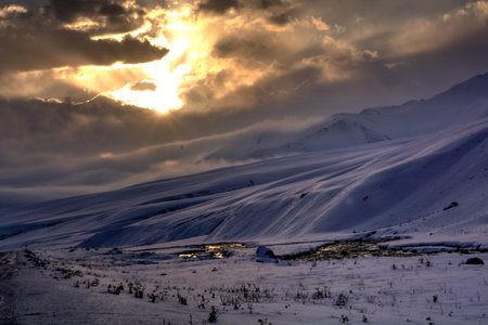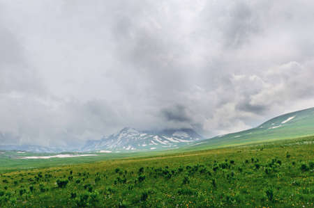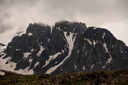 Beautiful scenery of the mountain valley with snow cap summit and against dark overcast sky. Outdoor and hiking concept