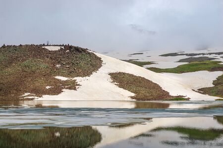 Alpine mountain lake landscape and view, snow and clouds in Javakheti, Georgia