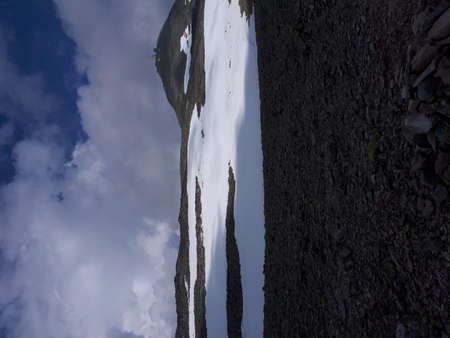 cold snowy lake with water mirror reflection of clouds and mountains peak