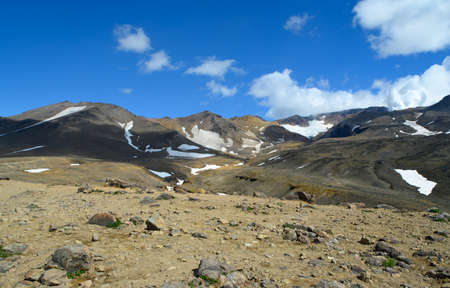 Hiking trail through alpine meadow. Beautiful landscape in the summer time. Kamchatka peninsula, Russia.