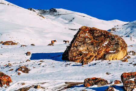 View of the snow-covered pasture and hills against the sky with clouds. Traveling in Kyrgyzstan.