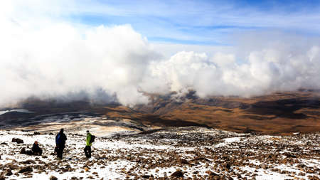 Aragats, Armenia - October 11, 2018: Tourists on the way to the crater of Mount Aragats, northern summit in Armenia